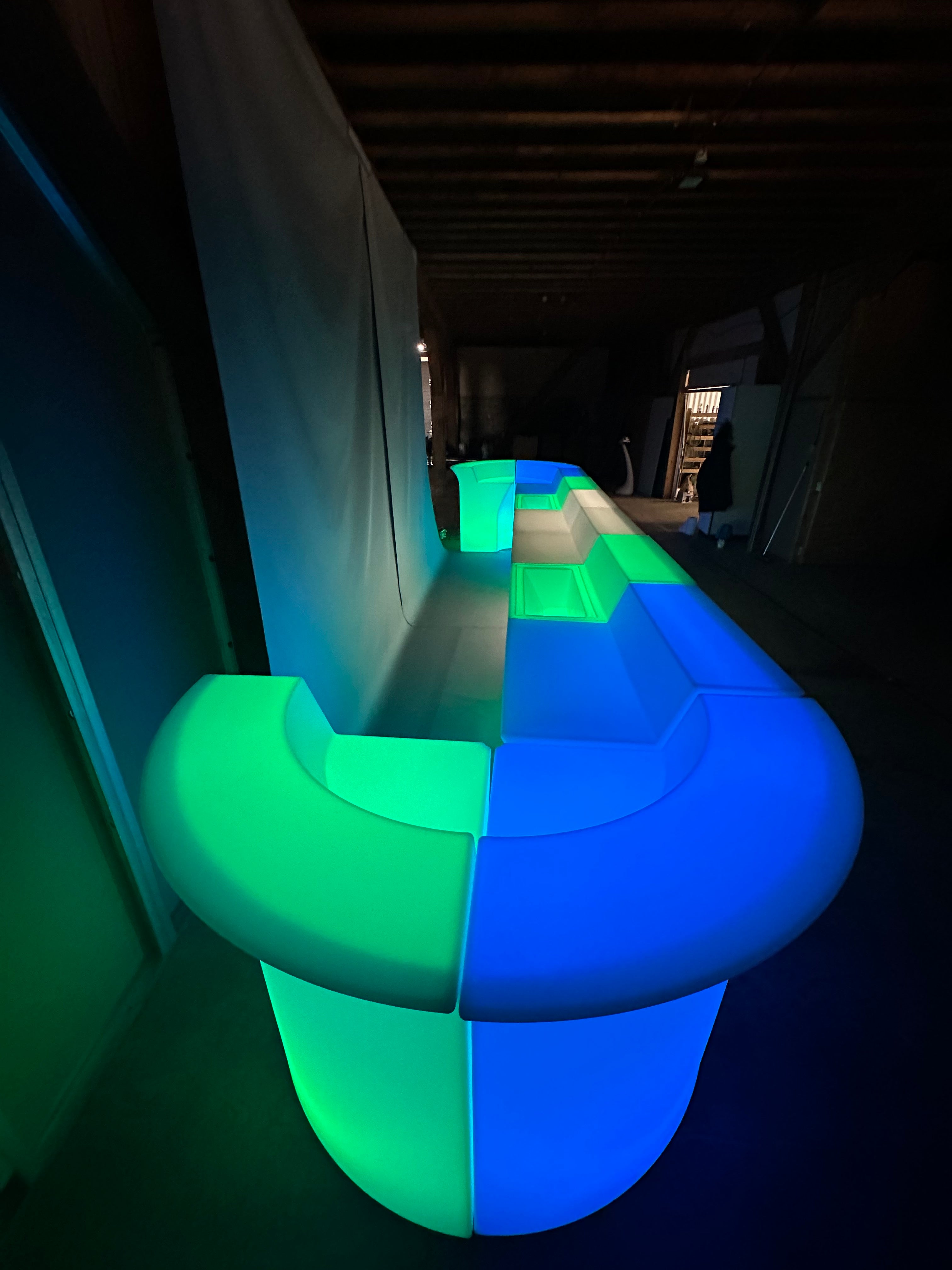 Notre bar lumineux Jumbo XXL en action : la pièce maîtresse spectaculaire de vos grands événements. Ce bar LED géant impressionne par ses dimensions et crée un point focal lumineux inoubliable pour vos réceptions.
