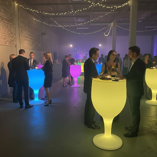 Nos mange-debout LED en action transforment vos cocktails et réceptions en expériences visuelles captivantes. Ces tables hautes lumineuses créent des points de rencontre élégants et modernes pour vos invités.